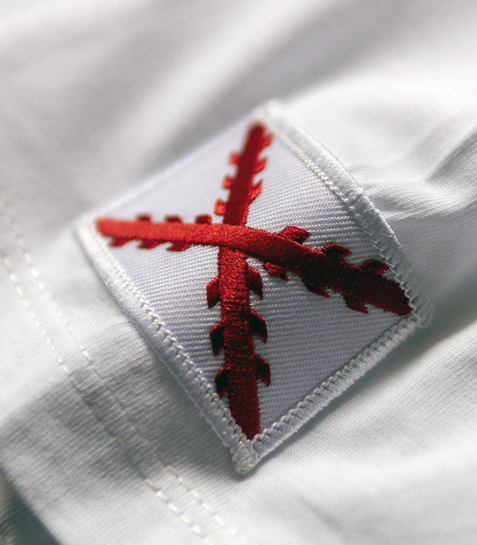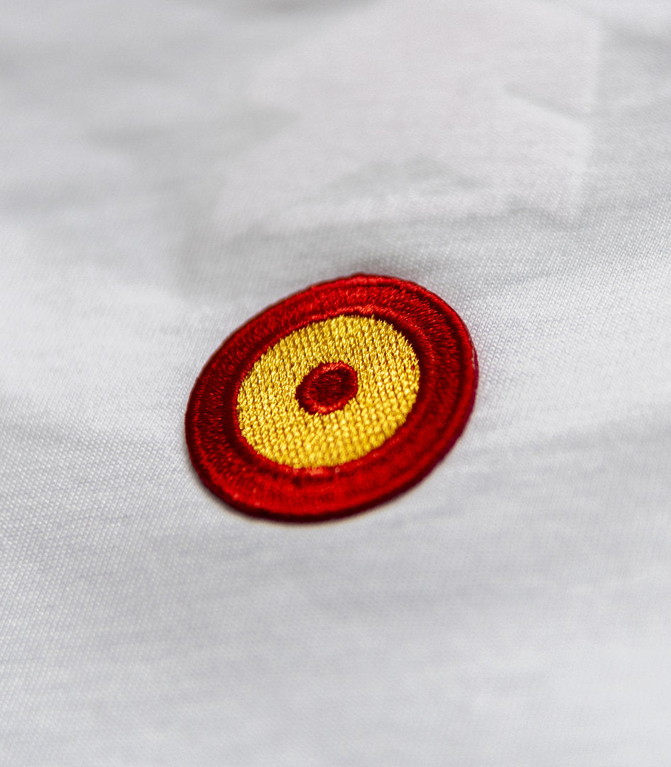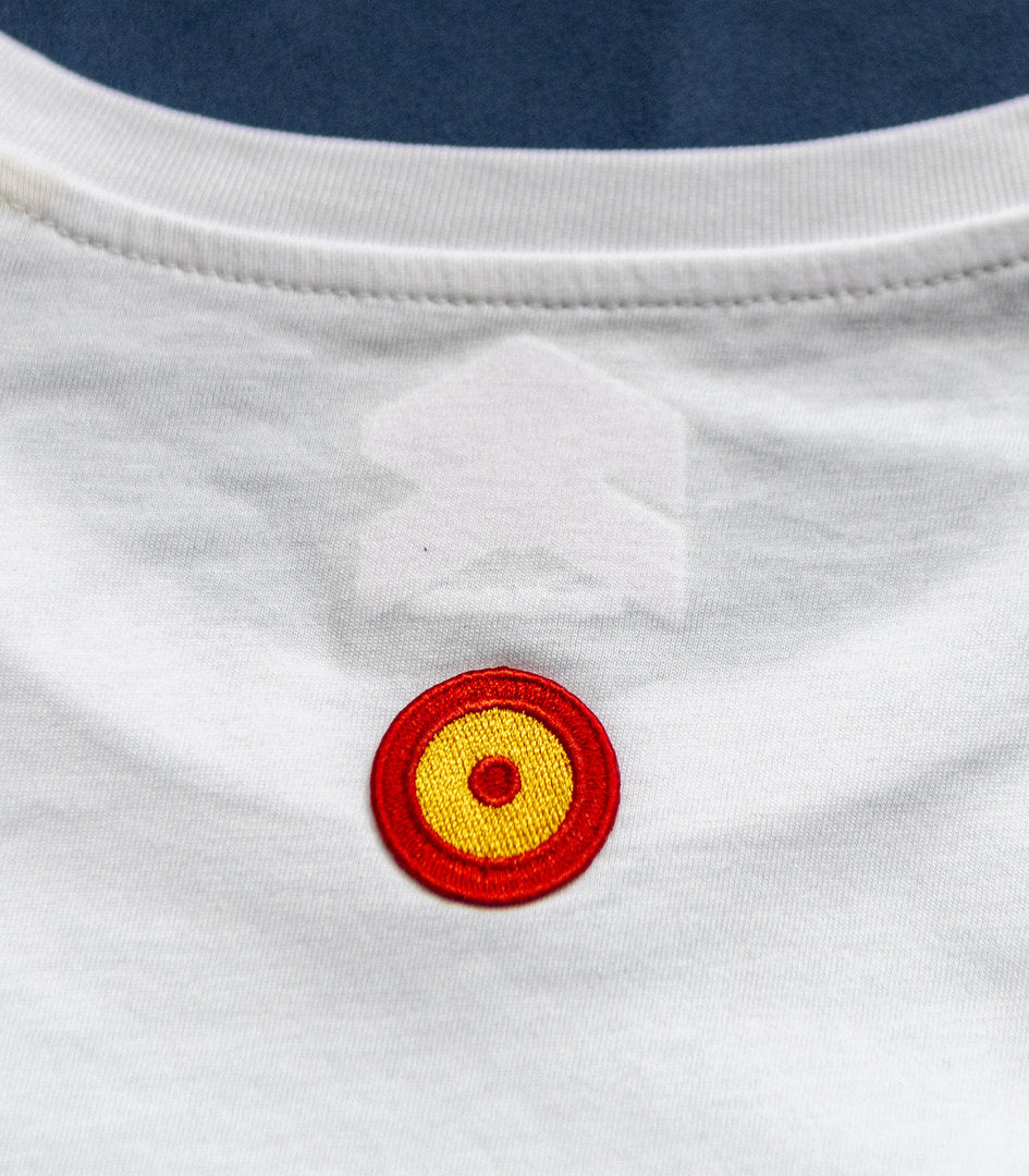 Es una camiseta exclusivamente fabricada en algodón orgánico 100% y color blanco, cuidada hasta el último detalle. En la parte delantera lleva un rótulo a la altura del pecho donde podemos leer HARRIER AV-8B II PLUS junto a la malla del propio avión y el roundel español bordado en la espalda. En la manga izquierda incorpora un parche bordado "Cruz de San Andrés". En la espalda tiene un original diseño y en el centro, impresa la fotografía en la que está basada la camiseta. Un retrato en color, impreso en "HD print", una tecnología que es capaz de resaltar hasta el último remache.