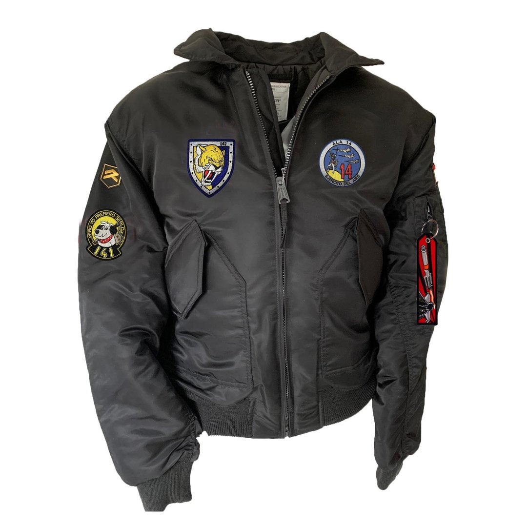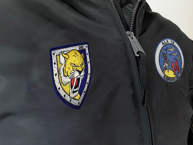 Auténtica cazadora de piloto CWU. Parches bordados oficiales del Ala 14 de la base aérea de Albacete, bandera de España y logo "R" en hombros.