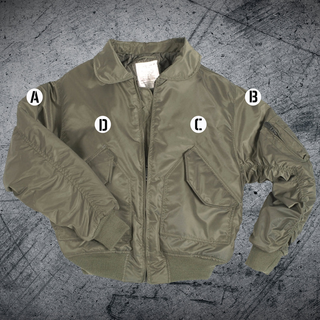 Existen cuatro zonas donde usted puede solicitar que le cosamos uno de nuestros parches bordados.