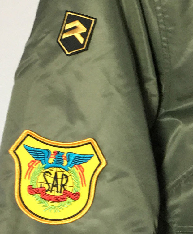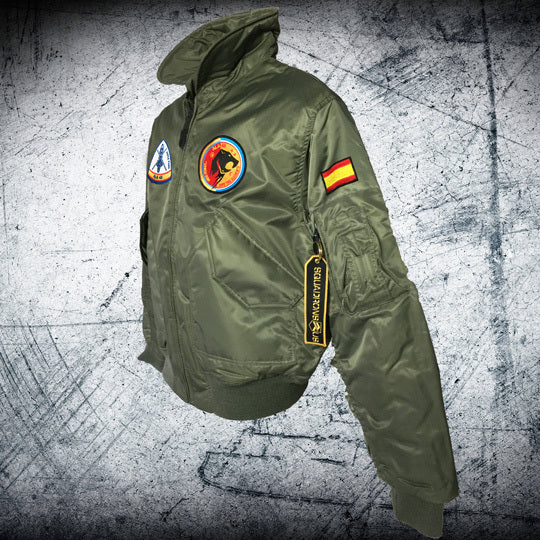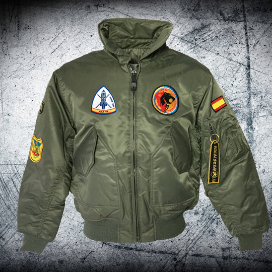 Auténtica cazadora de piloto CWU. Parches bordados oficiales del ALA 48, exactamente los mismos que los pilotos llevan en su indumentaria diaria. No son réplicas.