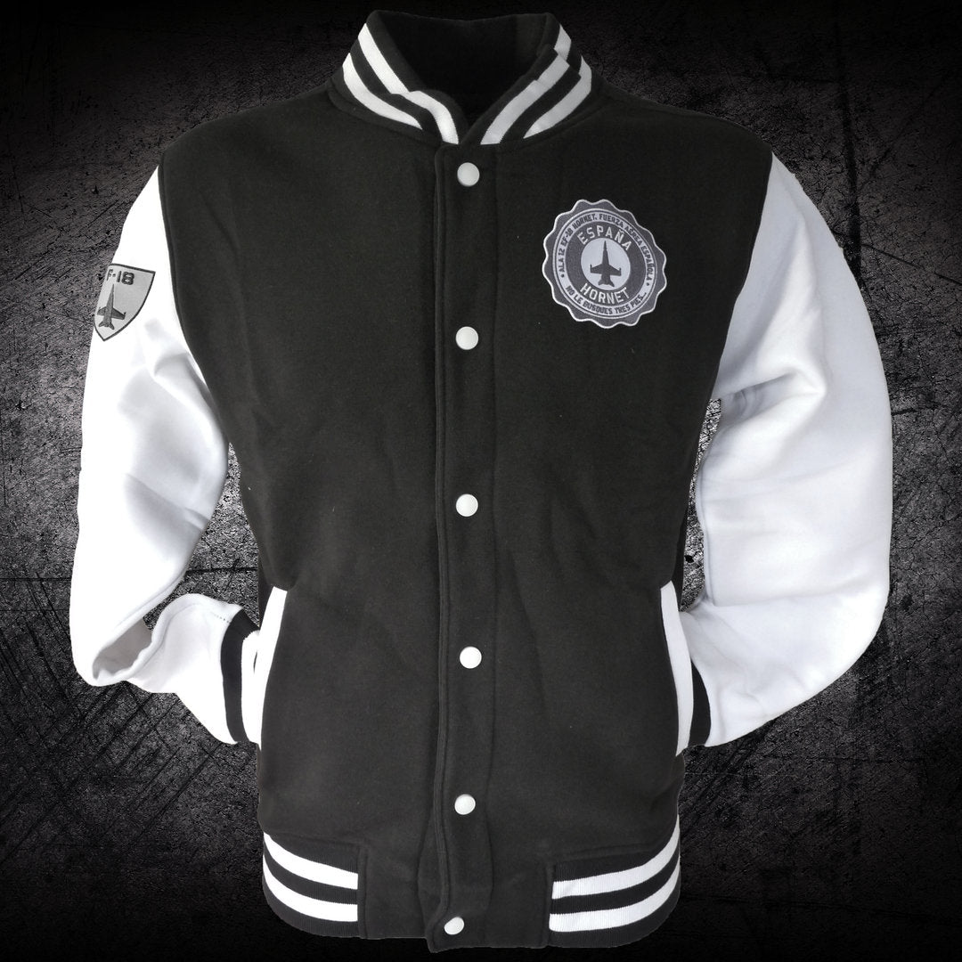 Cazadora Universitaria de felpa ALA 12. Con aplicaciones bordadas de alta calidad en pecho y hombro con motivos del EF-18 HORNET.