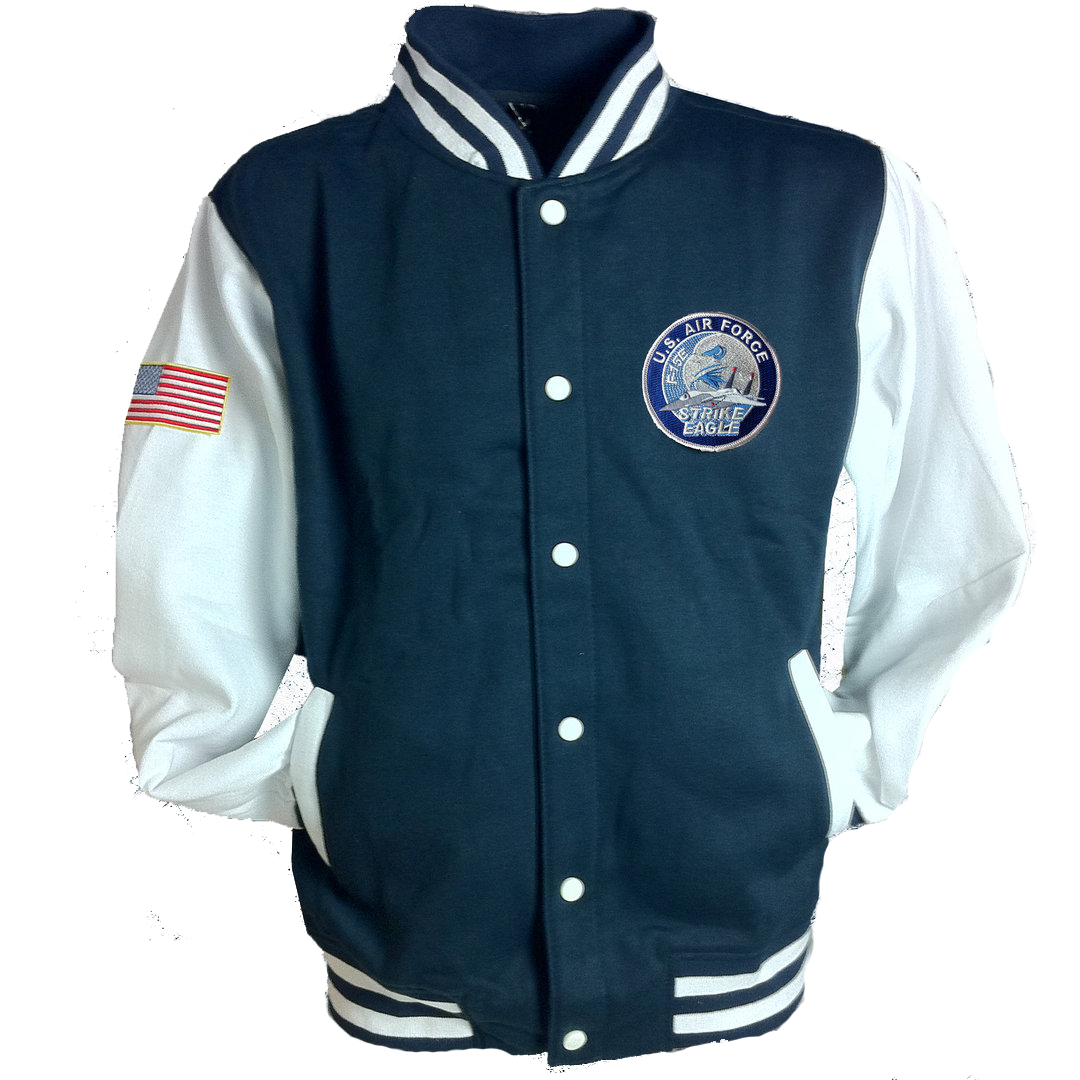 Cazadora Universitaria de felpa. Con aplicaciones bordadas de alta calidad con motivos del F-15 EAGLE.