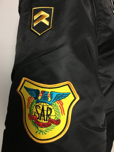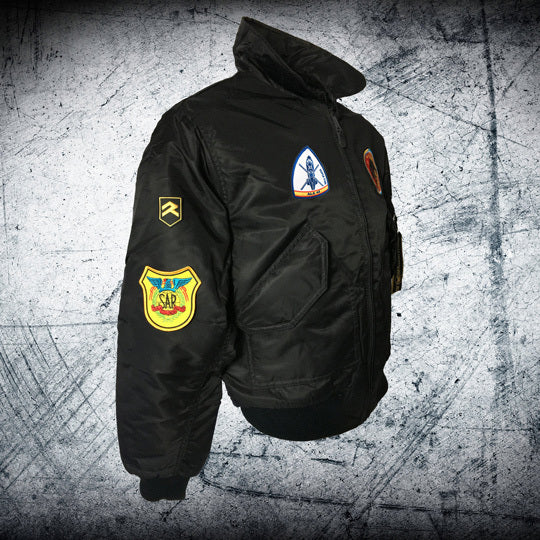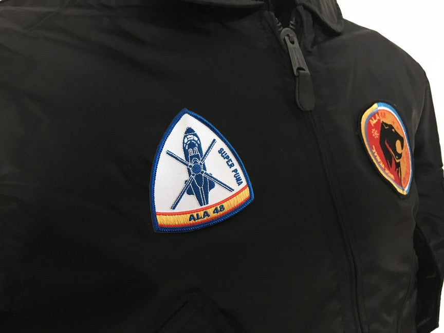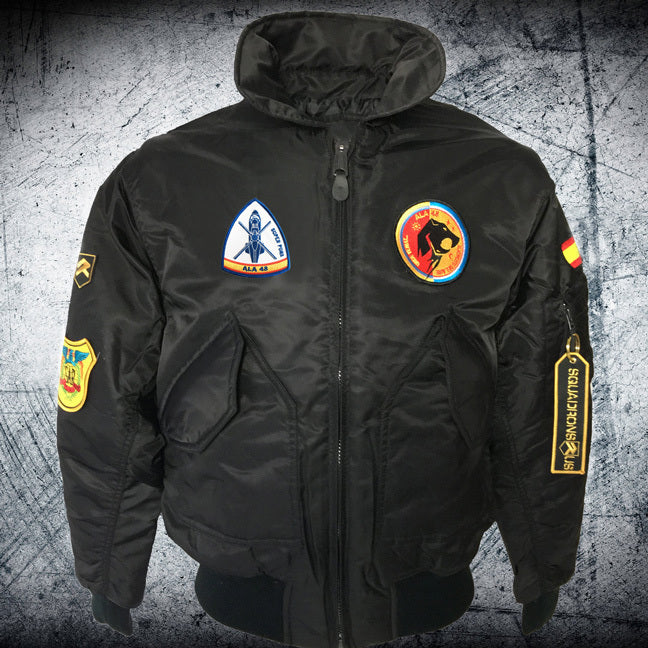 Auténtica cazadora de piloto CWU. Parches bordados oficiales del ALA 48, exactamente los mismos que los pilotos llevan en su indumentaria diaria. No son réplicas.