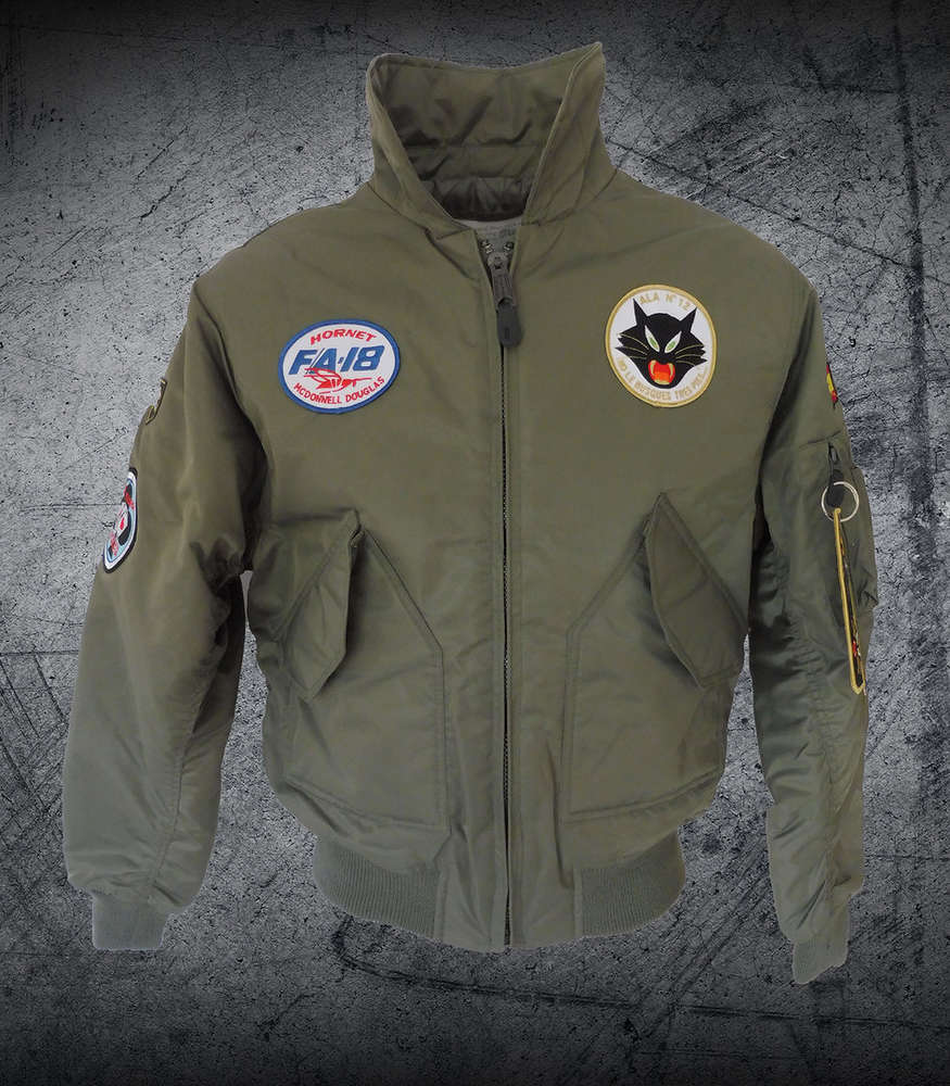 Auténtica cazadora de piloto CWU. Parches bordados oficiales del Ala 12 de la base aérea de Torrejón, bandera de España y logo "R" en hombros.